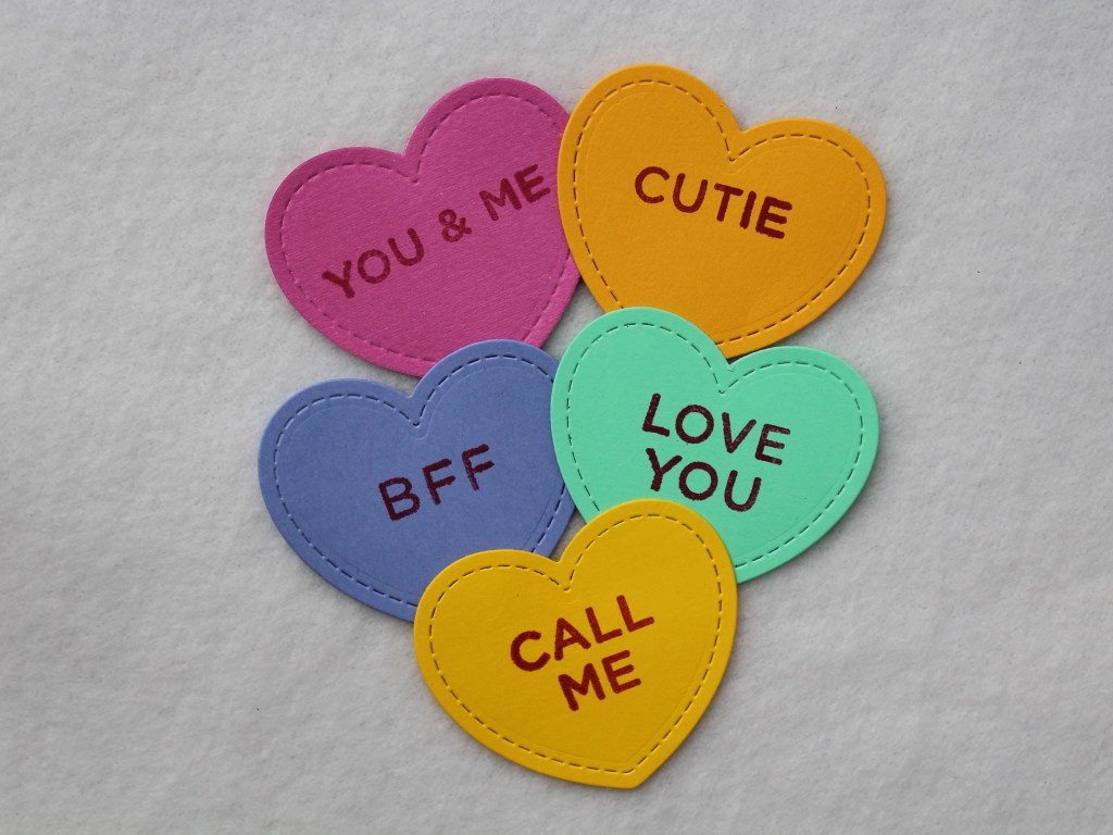 I tried eating them but preferred reading them. I loved reading, even in elementary school, and was fascinated by those sweet, short messages on heart-shaped candies. I hadn’t thought of them in years until I bought a stamp and die set.