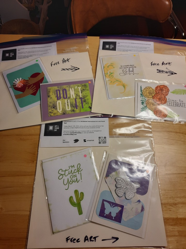 I had not heard of this holiday until an artist friend spoke to our art group. She participated and had such positive experience I immediately volunteered. I have taken part in Found Art Day for the past two years and will be doing so again this year. The Facebook below was posted by my group. It was the first year we participated. My friend Janis and I enjoyed hiding our art in plain sight. The third person is the talented photographer who received the email. I love that he posted it. I once received an email in appreciation too. Sharing your creations with others is what it’s all about.